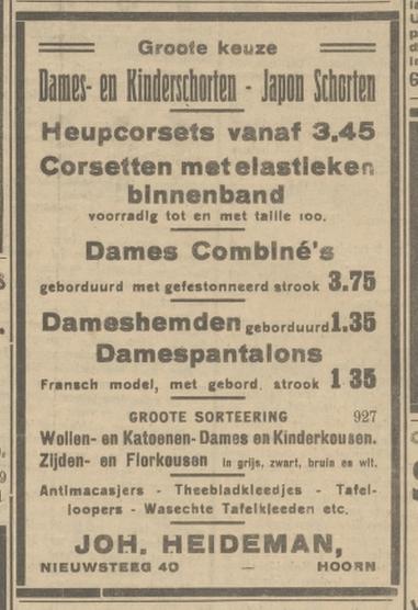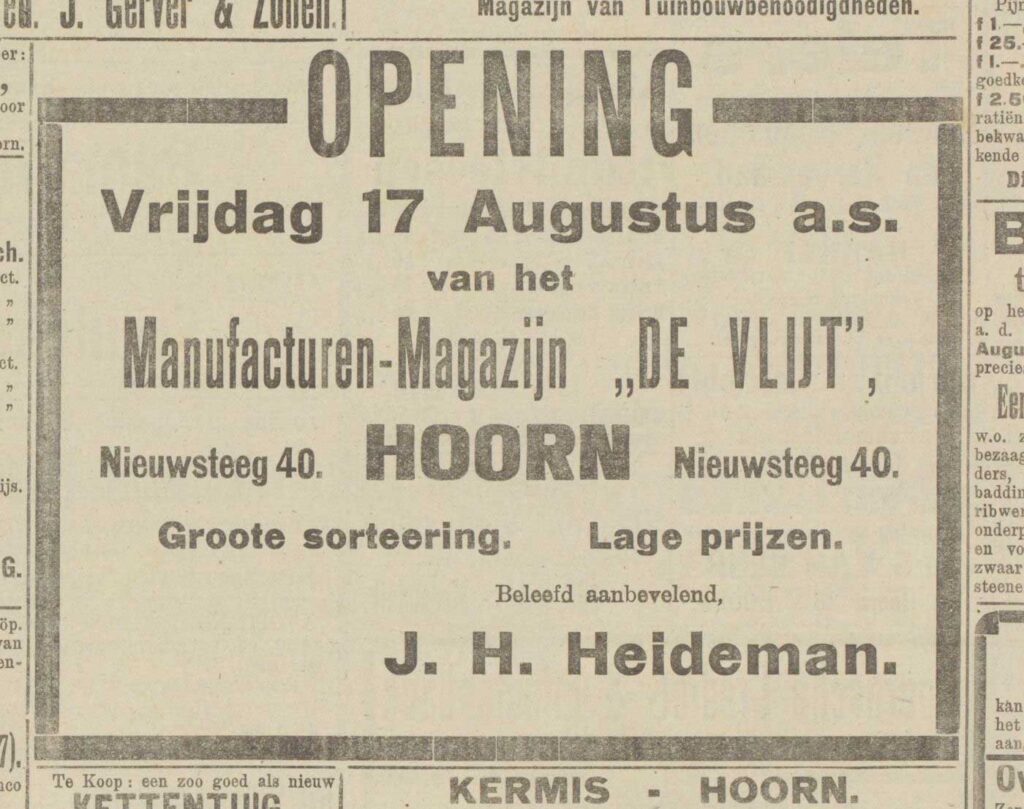 VIIIm. Johan Hendrikus Heideman, roepnaam Jo, zoon van Jan Hendrik Heideman (VIIe.), geboren Landsmeer 9 september 1888, manufacturier, opende in 1917 manufacturenzaak “De Vlijt” aan de Nieuwsteeg 40 in Hoorn, breidde de zaak later uit met de buurpanden nummer 36 en 38, woonde Nieuwsteeg 40 in Hoorn, overleden Hoorn 28 mei 1966, trouwde de eerste keer in Alkmaar op 16 augustus 1917 met Catharina Maria Hofstee, geboren Alkmaar 20 januari 1894, overleden Hoorn 1 november 1930; trouwde de tweede keer in Borne op 2 augustus 1932 met Euphemia Maria Gerarda Roetgerink, roepnaam Femie, geboren Weerselo 21 januari 1907, overleden Hoorn 5 april 1992.