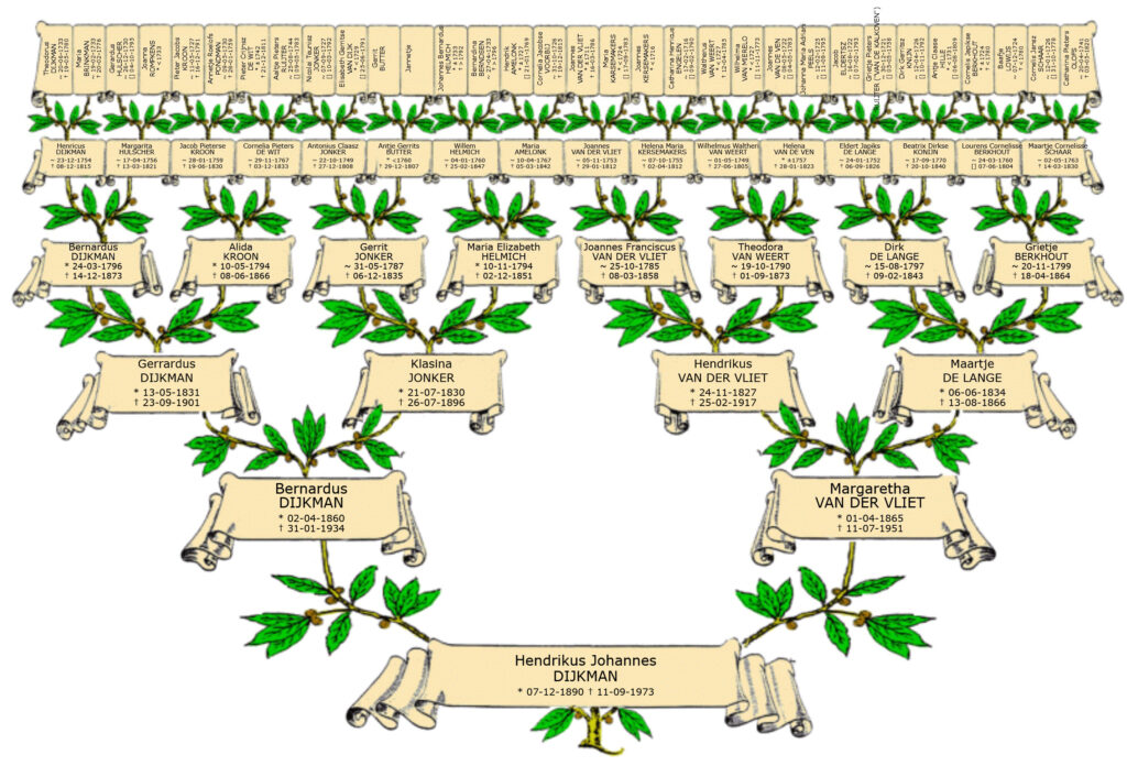 1. | Hendrikus Johannes Dijkman, roepnaam Henk, geboren Buiksloot 7 december 1890, rooms-katholiek, schilder, later drogist op de Nieuwendammerdijk 270 (eigendom), woonde Nieuwendammerdijk 281 (eigendom) en vanaf 1955 op de Nieuwendammerdijk 189 in Amsterdam-Nieuwendam, † Amsterdam 11 september 1973, begraven Amsterdam 15 september 1973 op de Noorderbegraafplaats in vak R42-3 diep, trouwde in Nieuwendam 17 april 1917 Margaretha Elisabeth Heideman, roepnaam Greet, geboren Landsmeer 12 januari 1890, rooms-katholiek, drogisterijhoudster, † Hilversum 10 mei 1976, begraven Amsterdam 15 mei 1976 op de Noorderbegraafplaats in vak R42-2diep, dochter van Jan Hendrik en Afra Steevers. |